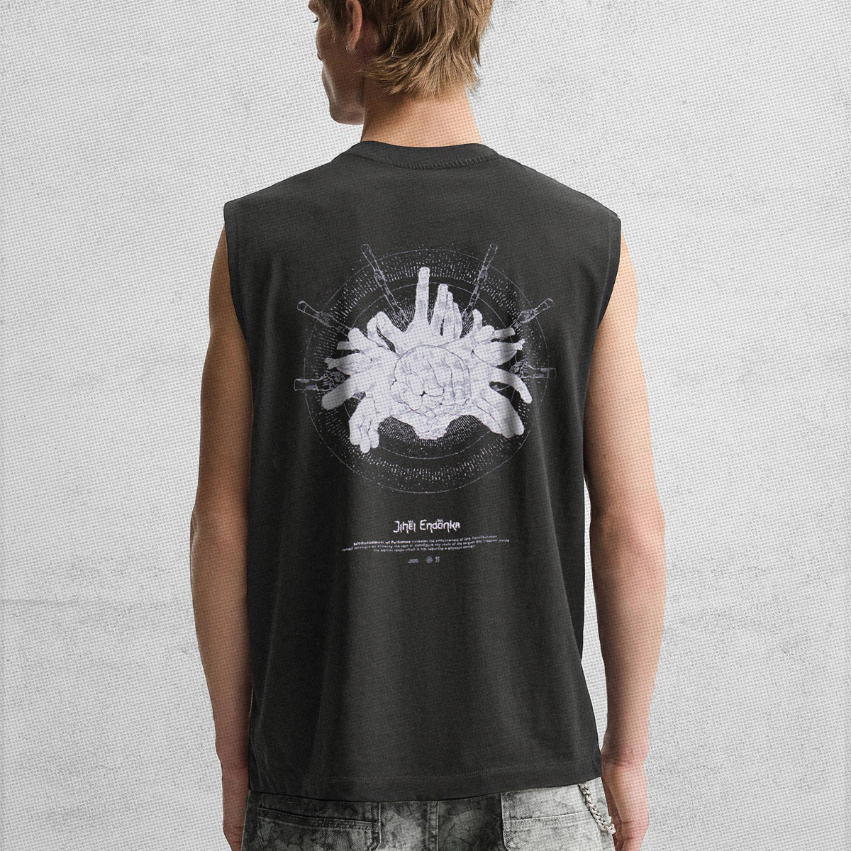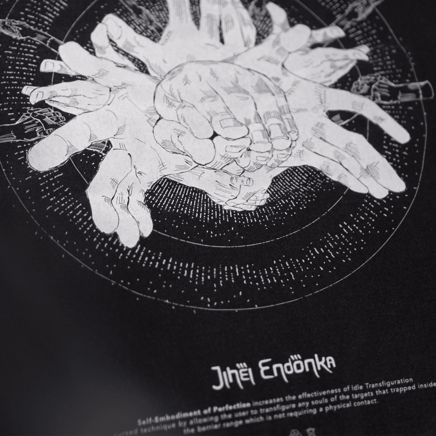 "Jihei Endonka" was inspired by Mahito, one of the most hated characters from Jujutsu Kaisen. The front design was his hand sign to activate domain expansion, and on the back was a symbolic bouquet of hands located at the core of this technique.