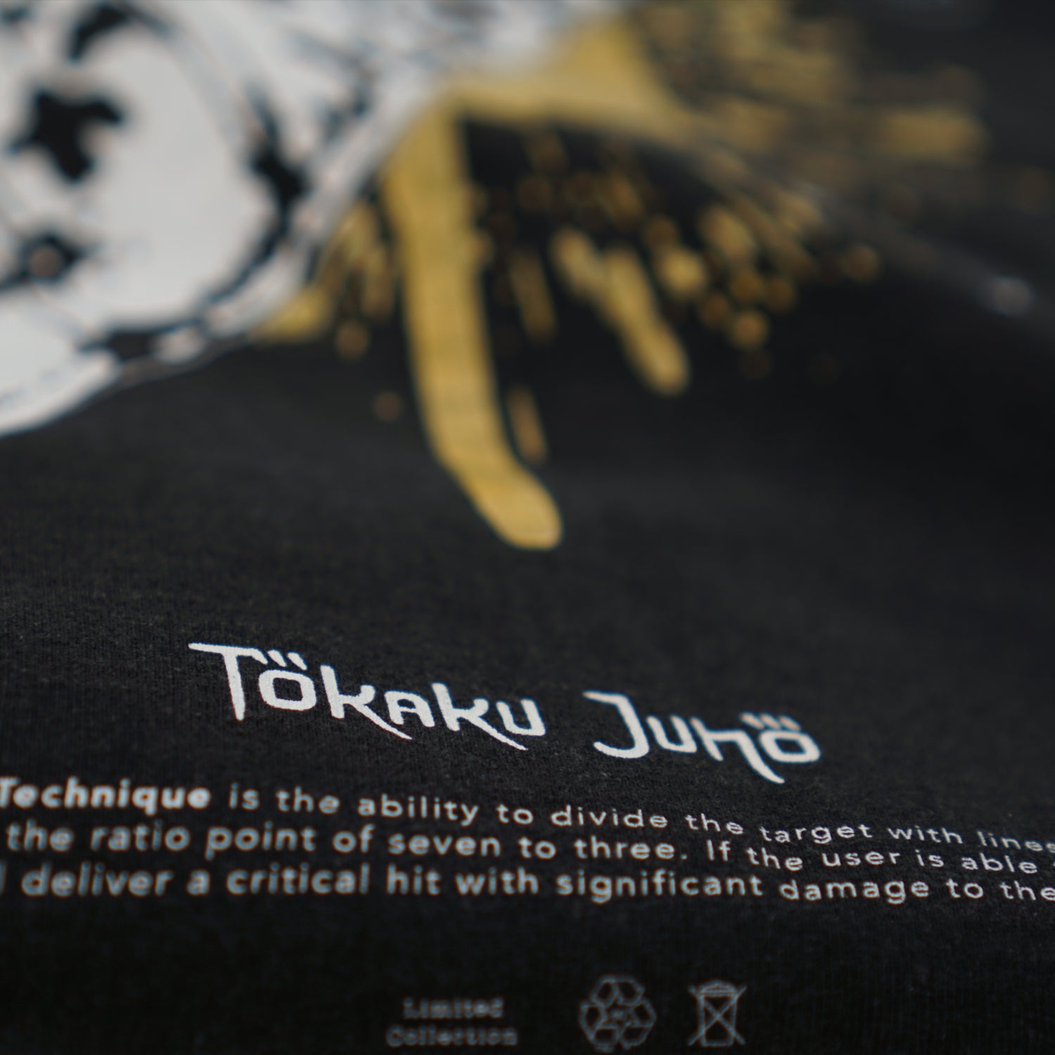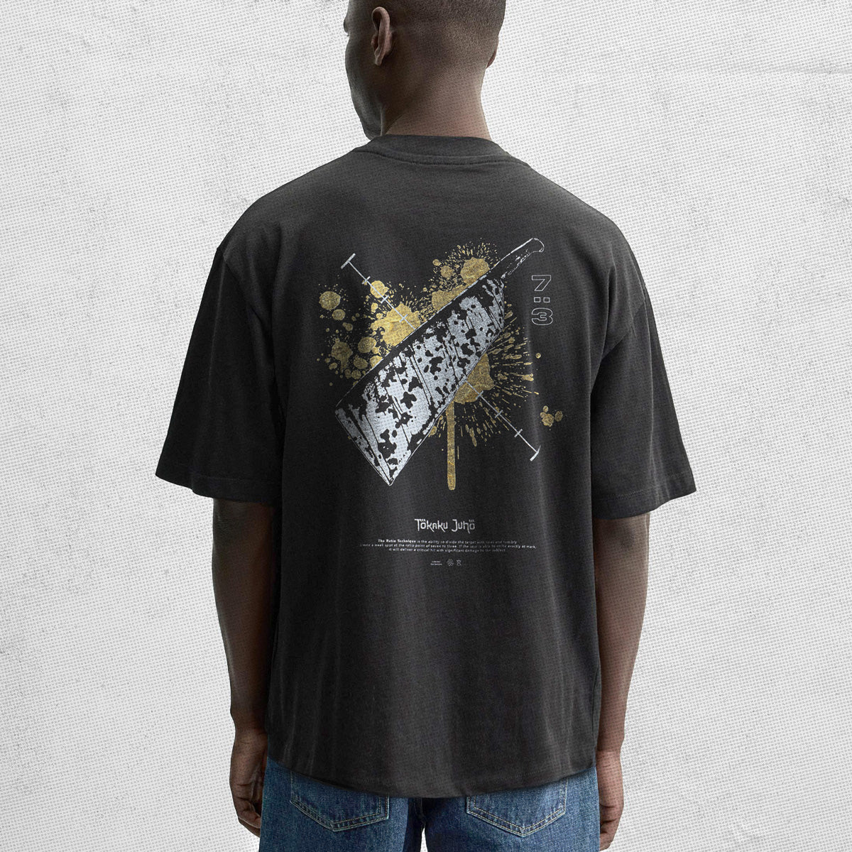"Tokaku Juho" a Japanese name for the 7:3 ratio technique used by Nanami Kento, a character from Jujutsu Kaisen. The front design was his hand using an overtime binding vow, on the back was his cursed blunt sword, a splash and 7:3 divided line.